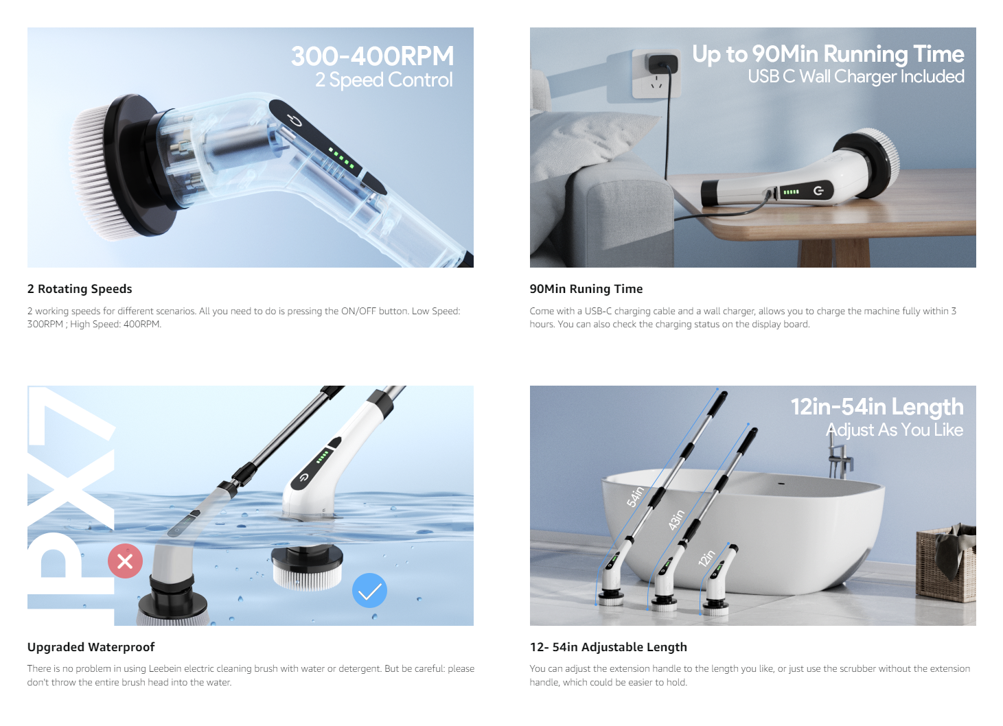 • 【8 Versatile Brush Heads】Leebein electric spin scrubber includes 8 replaceable cleaning brushes for various scenarios. Flat brush for surfaces like tile floor, wall, and pool; corner brush is great for cleaning grout, faucets, edges; cloth brush for wooden floor and furniture cleaning; the sponge is for the window. Moreover, you can even polish and wax your car with those heads.